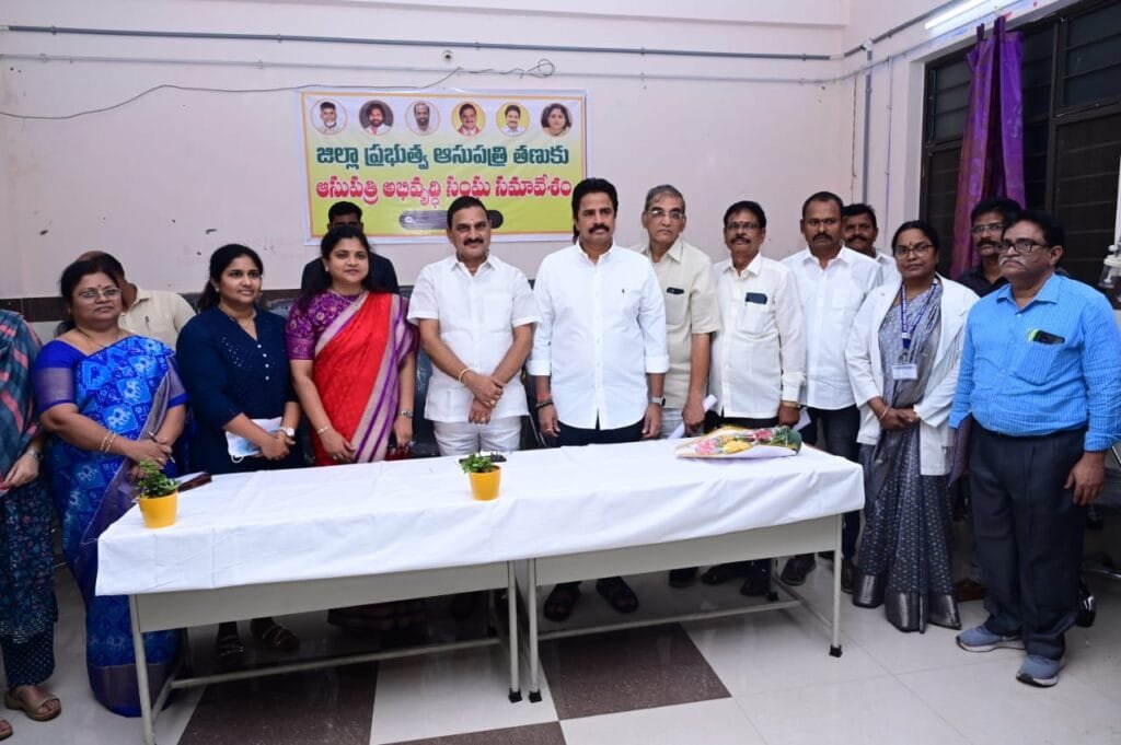 తణుకు జిల్లా ప్రభుత్వ ఆసుపత్రి అభివృద్ధి కమిటీ సమావేశం జిల్లా కలెక్టర్ మరియు కమిటీ చైర్మన్ చదలవాడ నాగరాణి అధ్యక్షతన బుధవారం నిర్వహించడం జరిగింది. ఈ సమావేశంలో కేంద్ర ఉక్కు, భారీ పరిశ్రమల సహాయం మంత్రి భూపతిరాజు శ్రీనివాస వర్మ, తణుకు నియోజకవర్గ శాసనసభ్యులు, కమిటీ కో చైర్మన్ ఆరుమిల్లి రాధాకృష్ణ, కమిటీ సభ్యులు పాల్గొన్నారు. ఈ సందర్భంగా కేంద్ర ఉక్కు, భారీ పరిశ్రమల సహాయం మంత్రి భూపతిరాజు శ్రీనివాస వర్మ మాట్లాడుతూ మన జీవన విధానంలో అన్నింటికంటే ముఖ్యమైనది వైద్యం అన్నారు. భారత ప్రధాని స్వర్గీయ అటల్ బిహారీ వాజ్ పాయ్ విద్యా, వైద్యం ఉచితంగా ఇస్తే మిగతావి ఏమి ఉచితంగా ఇవ్వాల్సిన అవసరం లేదని అనేవారిని ఈ సందర్భంగా గుర్తు చేసుకున్నారు. వైద్యానికి ఎక్కువ మొత్తంలో ఖర్చు చేయాలంటే కుటుంబాలు కుదేలైపోతున్నాయని, ప్రభుత్వ ఆసుపత్రిలో అన్ని సౌకర్యాలను ఏర్పాటు చేస్తే అందరికీ వైద్యం అందుబాటులో ఉండి, ఆర్థికంగా ఇబ్బంది పడకుండా ఉంటారని అన్నారు. తణుకు జిల్లా ప్రభుత్వ ఆసుపత్రి అభివృద్ధికి సంబంధించి అన్ని విధాల సహాయ సహకారాలను అందించడం జరుగుతుందని స్పష్టం చేశారు. కేంద్ర, రాష్ట్ర ప్రభుత్వాలు వైద్యానికి తొలి ప్రాధాన్యతను ఇవ్వడం జరుగుతుందన్నారు. అన్ని నియోజకవర్గాల్లో డయాలసిస్ కేంద్రాలను ఏర్పాటుకు ఆలోచన చెసి ఆ దిశగా చర్యలను చేపట్టడం జరిగిందన్నారు. అత్తిలిలో కూడా డయాలసిస్ కేంద్రం ఏర్పాటుకు నిధులను మంజూరు చేయడం జరిగిందని తెలిపారు. తణుకు ఆసుపత్రి అభివృద్ధికి సంబంధించిన పనుల అంచనాల నివేదికను అందజేస్తే అవసరం మేరకు నిధులను మంజూరు చేయడం జరుగుతుందని తెలిపారు. జిల్లాకు ఏ గ్రాంట్స్ వచ్చిన తొలి ప్రాధాన్యతను వైద్యానికి అందజేయాలని జిల్లా యంత్రాంగానికి సూచించినట్లు తెలిపారు. గత ప్రభుత్వం హయాంలో ప్రాథమిక ఆరోగ్య కేంద్రాలు నిర్వీర్యం అయిపోయాయని, మళ్లీ వాటికి పునర్జీవం కల్పించేలా చర్యలు తీసుకున్నట్లు తెలిపారు. ఆయుష్మాన్ భారత్ పథకం ద్వారా రూ.ఐదు లక్షలు పరిహారం అందుకోవచ్చని, 75 సంవత్సరాలు లోపు ఉన్నవారు దరఖాస్తు చేసుకునేలా పెంచడం జరిగిందన్నారు. దేశంలో 2014 నుండి 2024 వరకు 800 మెడికల్ కాలేజీలను, అంతకుముందు 50,000 ఉన్న మెడికల్ సీట్లను 1,10,000 కు పెంచడం జరిగిందన్నారు. దేశవ్యాప్తంగా 22 ఎయిమ్స్ ఉండగా మన రాష్ట్రంలో ఒక ఎయిమ్స్ మంగళగిరిలో వెయ్యి పడకలతో రూ.170 కోట్ల వ్యయంతో ఏర్పాటు చేసుకోవడం జరిగిందన్నారు.