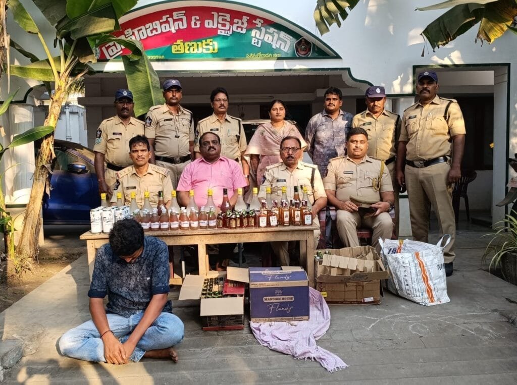 యానాం నుంచి ఇరగవరం మండలం కంతేరు గ్రామానికి ఏపీ 37సీఎల్ 7899 నెంబరు కలిగిన కారులో అక్రమంగా మద్యం తరలిస్తున్నట్లు వచ్చిన సమాచారంతో తణుకు ఎక్సైజ్ సీఐ సత్తి మణికంఠరెడ్డి ఆధ్వర్యంలో సిబ్బంది దాడి. 43 లీటర్లు పరిమాణం కలిగిన 219 మద్యం బాటిళ్లను స్వాధీనం. గతంలోనూ ఇదే తరహాలో యానాం నుంచి మద్యం తీసుకువచ్చి డోర్ డెలివరీ చేసే శ్రీనివాసరెడ్డి. స్వాధీనం చేసుకున్న మద్యం విలువ రూ. 3 లక్షలు కాగా కారుతో కలిపి మొత్తం సొత్తు విలువ రూ. 11 లక్షలు కాగా మరో ఇద్దరునిందితులైన ఈ కేసులో వెంకటసత్యనారాయణరెడ్డి అలియాస్ భరత్రెడ్డి, ప్రేమ్కుమార్లను పరారీ లో ఉన్నారని తెలిపారు. నిందితుడు శ్రీనివాసరెడ్డికి రిమాండ్. త్వరలోనే విరిని అరెస్టు చేస్తామని వెల్లడించిన కుమరేశ్వరన్.