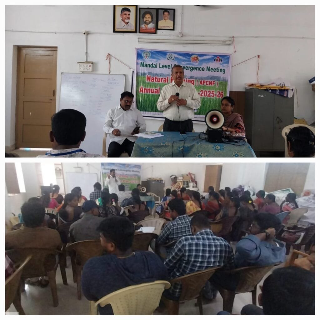 వరిపొలాలు కోతలకు సిద్దమవుతున్నవేళ ముందుగానే ప్రకృతి వ్యవసాయ సిబ్బంది, అగ్రికల్చర్ డిపార్ట్ మెంట్, మరియు డ్వాక్రా సంఘాల సమిష్టి ప్రణాళిక సిద్దంచేయడం కోసం ఏర్పాటుచేయబడిన సమావేశంలో ఎ.డి.ఏ. రమేష్ మాట్లాడుతూ ప్రకృతి వ్యవసాయ పద్దతులు పాటించడానికి రైతులకు ముందుగా నవధాన్యాల విత్తనాలు సమకూర్చి అందించడం చాలా ముఖ్యమైన అంశం గనుక ఈ మూడు టీమ్ లు కలసి పనిచేసి ప్రకృతి వ్యవసాయ ప్రగతిని సాదించాలని మన తణుకు డివిజన్ కు మంచిపేరు వచ్చేలా కృషి చెయ్యాలన్నారు. ఏ.పి.ఎమ్. రామకృష్ణ మాట్లాడుతూ ప్రకృతి వ్యవసాయ పద్దతుల పట్ల ప్రతి మహిళకు అవగాహన కలిగి ఉండాలని కిచెన్ గార్డెన్స్, పెరటితోటలు,వేసుకుని రసాయన రహిత కూరగాయలు ఆకుకూరలు పండించడంలో ముందుండి సామూహిక ఇన్ పుట్స్ తయారీలో భాగస్వాములు కావడం ద్వారా రసాయన రహిత ఆకుకూరలు కూరగాయలు సమ్రృధ్ధిగా లభిస్తాయని తద్వారా మనజీవనవిధానంలో మార్పులురావడం, దీర్ఘకాలిక వ్యాధులకు గురికాకుండా ఉండటానికి తోడ్పడతాయని అందుకు కావలసిన పూర్తి సహాయ సహకారాలు అందిస్తామని వివరించారు.