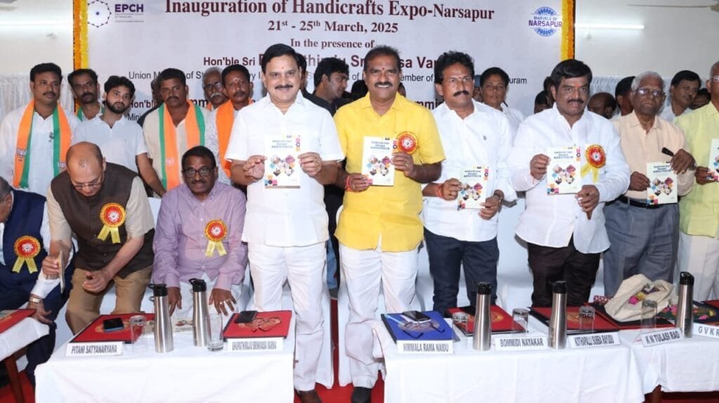 శనివారం నరసాపురం – రుస్తుంబాధ ఇంటర్నేషనల్ లేసు ట్రేడ్ సెంటరులో హ్యాండీక్రాఫ్ట్స్ ఎక్స్ పో ప్రారంభోత్సవ వేడుకల్లో కేంద్ర ఉక్కు,భారీ పరిశ్రమల శాఖ సహాయ మంత్రి శ్రీ భూపతిరాజు శ్రీనివాసవర్మ, రాష్ట్ర జలవనరులు శాఖ మంత్రి డాక్టరు నిమ్మల రామానాయుడు,ప్రభుత్వ విఫ్,స్థానిక శాసనసభ్యులు శ్రీ బొమ్మిడి నాయకర్,ఆచంట శాసన సభ్యులు శ్రీ పితాని సత్యనారాయణ,ఏపి కాపు కార్పొరేషన్ చైర్మన్ శ్రీ కొత్తపల్లి సుబ్బారాయుడు సంయుక్తంగా పాల్గొని, ఎగ్జిబిషన్ స్టాల్స్ ను పరిశీలించారు.