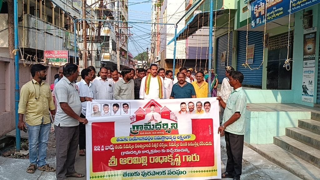 తణుకు నియోజకవర్గంలో తణుకు పట్టణంలో స్థానిక 22వ వార్డులో తణుకు శాసనసభ్యులు ఆరిమిల్లి రాధాకృష్ణ ఆధ్వర్యంలో తణుకు నియోజకవర్గం సమగ్ర అభివృద్ధి లక్ష్యంగా ప్రజల సమస్యల పరిష్కారానికి సత్వర చర్యలు, సమస్యల నుండి విముక్తి చేసేందుకు గ్రామదర్శిని కార్యక్రమం ప్రారంభించడం జరిగింది. ఈ సందర్భంగా ఆరిమిల్లి రాధాకృష్ణ మాట్లాడుతూ గడిచిన గత ఐదు సంవత్సరాలు కాలంలో తణుకు మున్సిపాలిటీ అభివృద్ధిని నిర్లక్ష్యం చేశారని అన్నారు. 22 వార్డు పర్యటనలో పాల్గొని స్థానికులు సమస్యలన్నీ అడిగి తెలుసుకున్నారు. గత ఐదు సంవత్సరాలుగా ప్రతి వార్డుల్లోనూ డ్రైనేజీల్లో సిల్ట్ తీయలేదని, డ్రైనేజీలు పూర్తిగా పాడైపోయి ఉన్నాయని అన్నారు. డ్రైనేజీలు పూడిక తీయకపోవడంతో ఇక్కడ కొద్దిపాటి వర్షం వచ్చిన రోడ్లన్నీ మునిగిపోయే పరిస్థితి ఏర్పడిందని అన్నారు. ఇటువంటి సమస్యలతో ఉన్న ఈ వార్డు నల్లజర్ల వీధి కి సంబంధించి 23 లక్షల రూపాయల సిసి రోడ్డు నిర్మాణం చేపట్టడానికి వెంటనే చర్యలు తీసుకుంటున్నామని తెలిపారు. వార్డులో ప్రజలందరూ కూడా సహకరించాలని ఖాళీ స్థలంలో ఉన్న యజమానులు మొక్కలను చెత్తను పూర్తిగా తొలగించి బాధ్యత యజమానులు చూసుకోవాలని అన్నారు. తణుకు పట్టణంలో అన్ని , వార్డుల్లో అభివృద్ధికి ప్రణాళిక సిద్ధం చేస్తున్నామని అన్నారు.15వ ఆర్థిక నిధులు భాగంగా కోటి రూపాయలు నిధులతో పలువార్డుల్లో డ్రైనేజీ నిర్మాణానికి ప్రతిపాదన పంపిస్తామని అన్నారు. ఈ కార్యక్రమంలో తెలుగుదేశం బీజేపీ జనసేన పార్టీల నాయకులు, ప్రజలు పెద్ద ఎత్తున పాల్గొన్నారు.