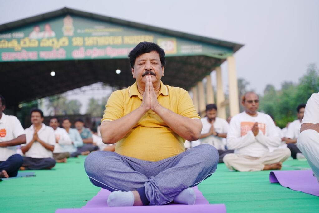 సర్ ఆర్థర్ కాటన్ నర్సరీ అసోసియేషన్ ఆధ్వర్యంలో కడియపులంక సత్యదేవ నర్సరీలో ఏర్పాటు చేసిన యోగాంధ్ర-2025 కార్యక్రమంలో పాల్గొన్న మంత్రి కందుల దుర్గేష్, స్థానిక ఎమ్మెల్యే గోరంట్ల బుచ్చయ్యచౌదరి, జిల్లా కలెక్టర్ పి.ప్రశాంతి**డ్రగ్స్ నివారణ, సహాయం కొరకు రాష్ట్ర ప్రభుత్వం ఏర్పాటు చేసిన ప్రత్యేక వ్యవస్థ ఈగల్ పోస్టర్ విడుదల చేసిన మంత్రి దుర్గేష్**యోగా ప్రతి ఒక్కరి జీవితంలో భాగం కావాలని సూచన*రాజమహేంద్రవరం: ప్రతి ఒక్కరు యోగా చేయడం వలన సంపూర్ణ ఆరోగ్యంగా ఉంటారని మానసిక సమస్యలు, అనారోగ్యం దూరమ వుతాయని మంత్రి కందుల దుర్గేష్ అన్నారు. శనివారం రాజమహేంద్రవరం రూరల్ నియోజకవర్గం కడియం మండలంలోని కడియపులంక లోని సర్ ఆర్థర్ కాటన్ నర్సరీ అసోసియేషన్ ఆధ్వర్యంలో శ్రీ సత్యదేవ నర్సరీలో నిర్వహించిన యోగాంధ్ర -2025 కార్యక్రమంలో మంత్రి కందుల దుర్గేష్ ముఖ్య అతిథిగా పాల్గొని స్థానిక ప్రజా ప్రతినిధి గోరంట్ల బుచ్చయ్య చౌదరి, జిల్లా కలెక్టర్ పి.ప్రశాంతి, ఇతర అధికారులతో కలిసి సూర్యనమస్కారం, ప్రాణాయామం తదితర యోగాసనాలు వేశారు. ప్రతి ఒక్కరి జీవితంలో యోగా భాగం కావాలని పిలుపునిచ్చారు. ఈ సందర్భంగా డ్రగ్స్ నివారణ, సహాయం కొరకు రాష్ట్ర ప్రభుత్వం ఏర్పాటు చేసిన ప్రత్యేక వ్యవస్థ ఈగల్ (ఎలైట్ యాంటీ నార్కోటిక్స్ గ్రూప్ ఫర్ లా ఫోర్స్మెంట్)కు సంబంధించి రూపొందించిన పోస్టర్ ను మంత్రి దుర్గేష్ విడుదల చేశారు.ఈ సందర్భంగా మంత్రి దుర్గేష్ మాట్లాడుతూ ప్రస్తుత కాలంలో మానసిక ఒత్తిడిని తట్టుకునేందుకు యోగాతో పాటు ధ్యానం, శారీరక వ్యాయామం కూడా చేయాలని తద్వారా మంచి మార్గం వైపు పయనించవచ్చని సూచించారు. యోగాంధ్రతో ఆరోగ్యాంధ్రను తీర్చిదిద్దుతామన్నారు. జూన్ 21వ తారీఖున అంతర్జాతీయ యోగా దినోత్సవం నాడు ప్రధానమంత్రి విశాఖపట్నంలో జరిగే కార్యక్రమంలో పాల్గొంటారని, ఈ నేపథ్యంలో గత కొన్ని రోజులుగా యోగా ఆవశ్యకతను వివరిస్తూ వివిధ కార్యక్రమాలు చేపట్టినట్టు తెలియజేశారు.యోగా ప్రతి ఒక్కరి జీవితంలో అంతర్భాగంగా చేసుకోవాలని,ప్రజలంతా యోగాభ్యాసం చేయాలని మంత్రి దుర్గేష్ పిలుపునిచ్చారు.