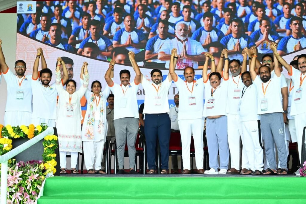 విశాఖలో శనివారం నిర్వహించిన యోగాంధ్ర 2025 కార్యక్రమంలో తణుకు ఎమ్మెల్యే రాధాకృష్ణ పాల్గొన్నారు. ప్రధాని నరేంద్ర మోదీ, ముఖ్యమంత్రి చంద్రబాబు నాయుడు హాజరైన ఈ కార్యక్రమంలో రాధాకృష్ణ పాల్గొన్నారు. యోగాంధ్ర 2025 కార్యక్రమం గిన్నిస్ బుక్ రికార్డు సృష్టించడం అభినందనీయమని ఆయన అన్నారు. యోగాలో సూరత్ రికార్డును అధిగమించడం గర్వకారణమని ఈ సందర్భంగా పేర్కొన్నారు. అనంతరం గిన్నిస్ బుక్ ప్రతినిధుల చేతుల మీదుగా మంత్రులు, ఎమ్మెల్యేలు, అధికారులకు జ్ఞాపికలు అందజేశారు.