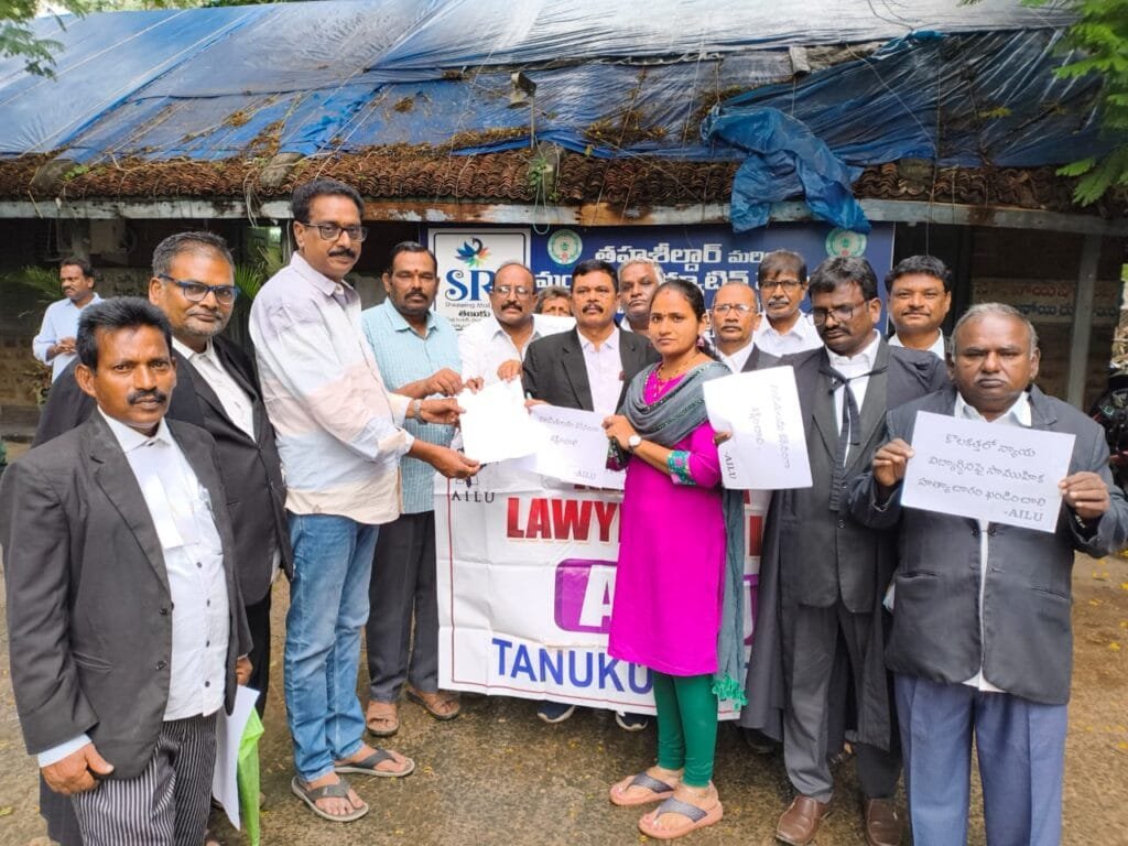 కలకత్తాలో న్యాయ విద్యార్థినిపై జరిగిన అత్యాచారంకు కారకులైన వారిని కఠినంగా శిక్షించాలని ఆలిండియా లాయర్స్ యూనియన్ డిమాండ్. మంగళవారం నాడు తణుకు తహసిల్దారు కార్యాలయము ముందు ఆలిండియా లాయర్స్ యూనియన్ ఆధ్వర్యంలో న్యాయవాదులు ధర్నా నిర్వహించి తహసిల్దారు కి మెమొరాండాన్ని అందజేసినారు. ఈ సందర్భంగా జిల్లాకార్యదర్శి కామన మునిస్వామి మాట్లాడుతూ దేశంలో ఈ మధ్యకాలంలో మహిళలపై దాడులు, అత్యాచారాలు, హత్యలు జరుగుతున్నాయని వాటిని కేంద్ర రాష్ట్రప్రభుత్వాలు అరికట్టాలని అన్నారు. మెడికల్ విద్యార్థినిపై జరిగిన సంఘటన రూపుమాపకుండా మరో సంఘటన జరగడం విచారకరమని అన్నారు. కాలేజీల్లో మహిళలకు పూర్తి రక్షణ కల్పించాలని దేశంలోని న్యాయవాదుల రక్షణ కోసం సమగ్రమైన చట్టం చేయాలని మునిస్వామి డిమాండ్ చేశారు. ఈ కార్యక్రమంలో న్యాయవాదులు కౌరు వెంకటేశ్వర్లు, కొండా శ్రీనివాసరావు, పుట్ల శ్రీనివాసు, చింతపల్లి నాగేశ్వరరావు, యూ.పులేశ్వరావు, పిట్ట శామ్యూల్ బర్రె విక్టర్ బాబు, సామాజిక న్యాయ పోరాట సమితి జిల్లా అధ్యక్షులు యార్లగడ్డ రవీంద్ర, న్యాయవాదుల సంఘం ప్రధాన కార్యదర్శి ఏమని సిద్దేశ్వర ప్రసాదు పాల్గొన్నారు.