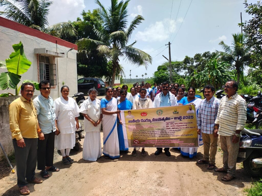 జాతీయ డెంగ్యూ మాసోత్సవం జూలై -2025 , సందర్భంగా ఉండ్రాజవరం ప్రాధమిక ఆరోగ్యకేంద్రం నందు డెంగ్యూ వ్యాధి పైన అవగాహన మరియు ర్యాలీ నిర్వహించడం జరిగింది.ఈ కార్యక్రమం నందు డాక్టర్ బి.దుర్గా మహేశ్వర రావు , డాక్టర్ ఆర్.ఉషా దేవి గారు, మాట్లాడుతూ వర్షాకాలంలో వచ్చే అంటువ్యాధులు ల పైన, మరియు దోమల వల్ల వచ్చే మలేరియా , డెంగ్యూ , చెకెన్ గున్యా , వంటి వ్యాధుల పైన అప్రమత్తముగా ఉండాలని తెలియజేశారు, దోమలు కుట్టకుండా ప్రతి ఒక్కరూ దోమతెరలు వాడాలని సూచించారు, జ్వరం తో బాధపడే వారు, నిర్లక్ష్యం చేయకుండా వెంటనే ప్రాధమిక ఆరోగ్య కేంద్రము నకు వచ్చి తగిన రక్త పరీక్షలు చేయించుకుని అవసరమైన మందులు సకాలం లో వాడాలని తెలియజేశారు, వర్షాకాలం లో దోమలు వృద్ది చెందకుండా ఇంటి పరిసర ప్రాంతాలు నిల్వ ఉన్న నీటిని లేకుండా చూసుకోవాలని తెలియజేశారు. ప్రతి శుక్రవారం ఫ్రై డే- డ్రై డే నిర్వహించాలని తెలియజేశారు.ఇంటి ప్రాంగణం లో టైర్లు , కాలీ కొబ్బరిబొండాలు , నీటి తోట్టెలలో దోమ లార్వాలు లేకుండా చూసుకోవాలని తెలియజేశారు.ఈ కార్యక్రమం లో పబ్లిక్ హెల్త్ నర్స్ కేడివిఎల్, కుమారి, ఆరోగ్య పర్యవేక్షకులు ఏ. శ్రీరామ మూర్తి, రత్నకుమారి, ఎం.ఎల్.హెచ్.పి లు, మహిళా ఆరోగ్యకర్తలు, హెల్త్ అసిస్టెంట్ లు, ఆశా కార్యకర్తలు పాల్గొన్నారు.