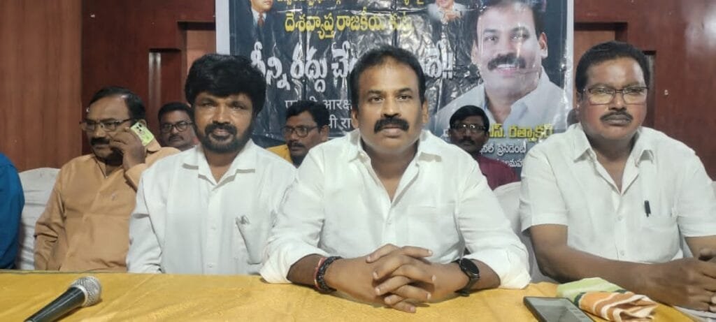 మిత్రులారా ఎస్సీ వర్గీకరణ దళితుల ఐక్యతపై దేశ వ్యాప్త మోడీ, బిజెపి కుట్ర ఈ కుట్ర లో భాగస్వామి చంద్రబాబు నాయుడు మాల సామాజిక వర్గంపై పగబట్టేసి తొక్కేసే కార్యక్రమాన్ని భుజాన్ని వేసుకుని నడిపిస్తున్నాడు మిత్రులారా, అన్ని రాజకీయ పార్టీలు మాల సామాజిక వర్గం పై తెలుగు రాష్ట్రాల్లో కత్తిగట్టాయి, దళితులను ముఖ్యంగా మాలలను హోల్సేల్గా వాడుకున్నటు వంటి హోల్సేల్ మేనమామ, జగన్మోహన్ రెడ్డి దీనిపై కనీసం నోరు మెదపకపోవడం ఈనాటికి తన స్టాండ్ ఏంటో చెప్పకపోవడం అత్యంత బాధాకరం కులాన్ని మతాన్ని రెచ్చగొట్టి ఈ దేశాన్ని విభజించి దేశాన్ని అమ్ముకునే పనిలోపడ్డాడు మోడీ అతని గుజరాతి పరివారం మొత్తం, ఎలక్షన్ కమిషన్ పావుగా వాడుకుని దొంగతనంగా గెలిచి తన పబ్బం గడుపుకుంటూ ఉన్నాడు. రిజర్వేషన్ పేరుతో ఎంగిలి మెతుకులు పడేసి అందులో వాటాల కోసం కొట్టుకు చావండి అనే ఉద్దేశంతోనే ఈ ఎస్సీ వర్గీ కరణ తలపైకి తేవడం జరిగింది. మిత్రులారా ఈ దేశంలో అన్ని రాజ్యాంగ వ్యవస్థల్ని మోడీ నిర్వీర్యం చేశారు దమ్ముంటే ఎలక్షన్లు రద్దుచేసి స్వాతంత్రంగా బ్యాలెట్ పేపర్ తో గెలిచి తన సామర్థ్యాన్ని నిరూపించు కోవాలి. బిజెపి,కులాల మతాల పేరుతో ప్రజలను విభజించి పాలించే పద్ధతి ఎంతో కాలం కొనసాగదన్న విషయాన్ని బిజెపి గమనించాలి. అపూర్వ సహోదరులు గురు శిష్యులు చంద్రబాబు నాయుడు రేవంత్ రెడ్డి ఇద్దరు కూడా మాల సామాజిక వర్గం పై సాధిస్తున్న కక్ష సాధింపు విషయంలో ఇకనైనా పునర్ ఆలోచన చేసుకోవాలి ఎస్సీ వర్గీకరణ తప్పు వెనక్కి తీసు కోవాల్సిందే, తెలుగు రాష్ట్రాల్లో జరిగిన ఎస్సీ వర్గీకరణ టెంపరరీ మాత్రమే శాంతియుత నిరంతర పోరాటం పార్లమెంట్లో అమెండ్మెంట్ చేసేవరకు, ఇప్పుడు ఇచ్చిన ఏడుగురు జడ్జిల తీర్పును 11 జడ్జిల, అంతకన్నా ఎక్కువ జడ్జిలతో ఈ తీర్పును పునః సమీ క్షించేంతవరకు ఈ నిరంతర శాంతియుత పోరాటం కొన సాగుతుంది. ఈ కార్య క్రమంలో గొల్ల ఈశ్వరరావు , మత్తి రత్నారావు, గొడుగు రాజు, సిమ్మాల దుర్గాప్రసాద్, శ్యామల రావు, నెల్లి సూరి బాబు తదితరులు పాల్గొన్నారు.
