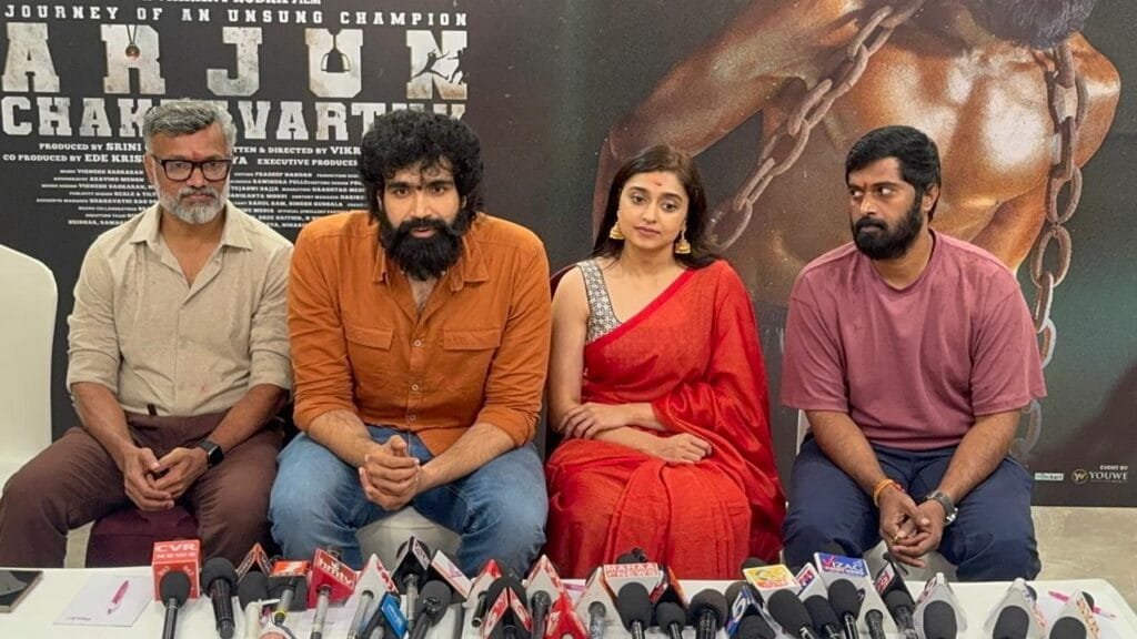 కబడ్డీలో రాణించడానికి పడిన శ్రమ ఆధారంగా రూపొందించిన వాస్తవగాథ ‘అర్జున్ చక్రవర్తి’ చిత్రమని హీరో విజయ రామరాజు తెలిపారు. ఈ నెల 29న విడుదల కానున్న నేపథ్యంలో మంగళవారం విశాఖలోని దశపల్ల హోటల్లో చిత్ర బృందం సందడి చేసింది. కథానాయ కుడు విజయ రామరాజు మాట్లాడుతూ ఈ చిత్రానికి ఇప్పటికే మంచి స్పందన లభించిందని, అన్ని వర్గాల ప్రేక్షకులను ఆకట్టు కుంటుందన్నారు. అర్జున్ చక్రవర్తి అనే కబడ్డీ ఛాంపియన్ బయోపిక్ ను దర్శకుడు విక్రాంత్ రుద్ర తెరకెక్కించారన్నారు. “అర్జున్ చక్రవర్తి కేవలం సినిమా మాత్రమే కాదు నా తొమ్మిది సంవత్సరాల కల అని అన్నారు. అనంతరం నిర్మాత శ్రీని గుబ్బల మాట్లాడుతూ ఇప్పటికే ఈ సినిమాకు 46 ఇంటర్నేషనల్ ఫిల్మ్ అవార్డ్ వచ్చాయని. ఈ చిత్రం ఆగస్టు 29న ప్రేక్షకుల ముందుకు రానుందన్నారు. ఇటీవల ట్రైలర్ లాంచ్ చేశామని ఆద్యంతం ఆకట్టుకున్న ట్రైలర్ సినిమాపై అంచనాలని మరింత పెంచిందన్నారు. హీరో విజయ్ ఈ సినిమా కోసం ప్రాణం పెట్టి పనిచేశాడన్నారు. అనంతరం పుష్ప2 యాక్ట్ చేసిన దయానంద రెడ్డి మాట్లాడుతూ అర్జున్ చక్రవర్తిగా మైనస్ డిగ్రీల్లో షర్టు లేకుండా విజయరామరాజు నటించాడని. ఈ సినిమా తప్పకుండా అందరికీ నచ్చుతుందని నమ్మకం ఉందన్నారు. గొప్ప థియేట్రికల్ అనుభూతినిచ్చే సినిమా ఇది అని అన్నారు. హీరోయిన్ సీజా రోజ్ మాట్లాడుతూ మా డైరెక్టర్ ఈ సినిమాను నెక్స్ లెవెల్‌లో తీశారని. మా నిర్మాత లేకపోతే ఇంత మంచి సినిమా లేదన్నారు. ఈ సినిమాతో చాలా మంచి సక్సెస్ వస్తుందని ఆశిస్తున్నాం అని ఆమె తెలిపారు. యాక్టర్ దుర్గేష్ మాట్లాడుతూ “ఆగస్టు 29న ప్రో కబడ్డీ ప్రారంభమవుతుంది. అదే రోజున నేషనల్ స్పోర్ట్ డే. కబడ్డీ బ్యాక్ డ్రాప్‌లో తెరకెక్కిన ఈ సినిమా ఆ రోజున రిలీజ్ అవుతుంది”అని తెలియజేశారు. ఈ కార్యక్రమంలో సినిమా యూనిట్ సభ్యులు పాల్గొన్నారు.
