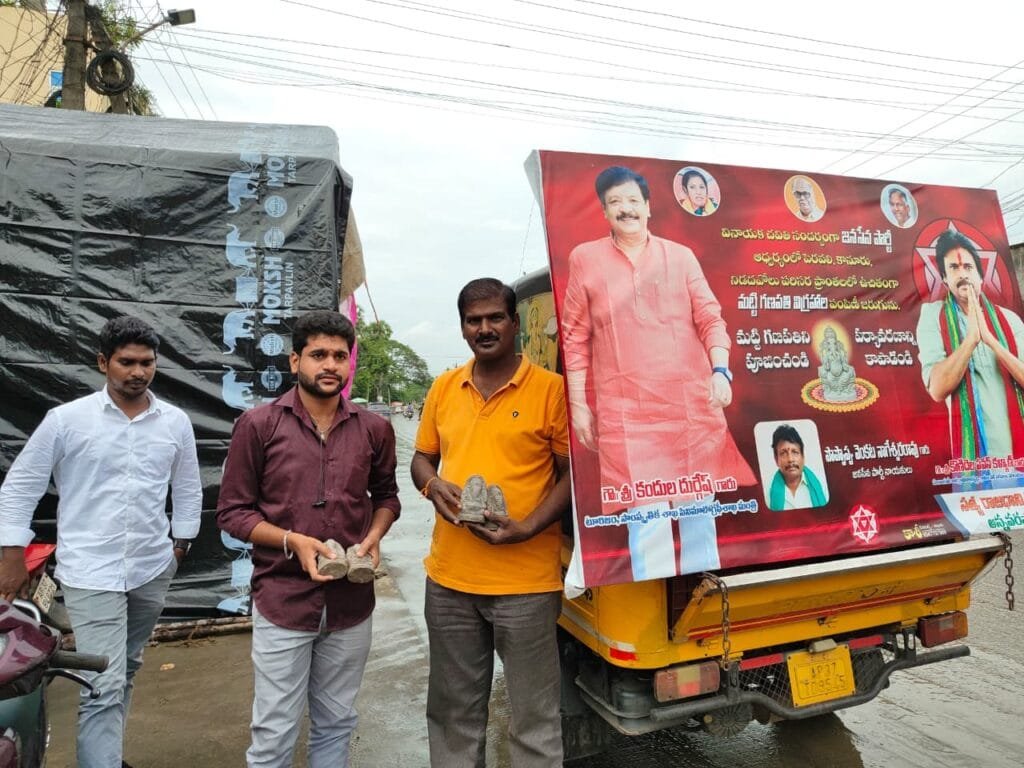 తూర్పుగోదావరి జిల్లా పెరవలి మండలం అన్నవరప్పాడు పి.ఎ.సి.ఎస్. అధ్యక్షులు, జనసేన నాయకలు పొప్పుప్పు నాగేశ్వరరావు ఆధ్వర్యంలో సోమవారం నిడదవోలు నియోగికవర్గం లో పెరవలి, ఉండ్రాజవరం, మోర్త, కానూరు, నిడదవోలు గ్రామాలలో మట్టి వినాయక ప్రతిమలను పంపిణీ చేశారు. రంగుల విగ్రహాలు వద్దు మట్టి విగ్రహాలు ముద్దు అనే స్లోగన్ తో గత కొన్ని సంవత్సరాల నుంచి నియోజికవర్గంలో వినాయక మట్టి వినాయక ప్రతిమలను పంచి పెట్టడం జరుగుతుంది, అందులో భాగంగా సోమవారం పంచి పెట్టడం జరిగిందని జనసేన నాయకులు తెలియజేశారు. ఈ సందర్భంగా రాజకీయ విషయాల్లోనే కాకుండా దైవ కార్యక్రమాల్లో కూడా తనదైన భక్తి భావం చూపిస్తున్న అన్నవరప్పాడు పి.ఎ.సి.ఎస్. అధ్యక్షులు పొప్పుప్పు నాగేశ్వరరావును పలువురు గ్రామస్తులు అభినందించారు. ఈ కార్యక్రమంలో పిండి సూరిబాబు , పొప్పొప్పు శివ , బోడపాటి గణేష్, డేగల అన్నవరం , శిరగం గణపతి ఇతర జనసేన నాయకులు, కార్యకర్తలు పాల్గొన్నారు.