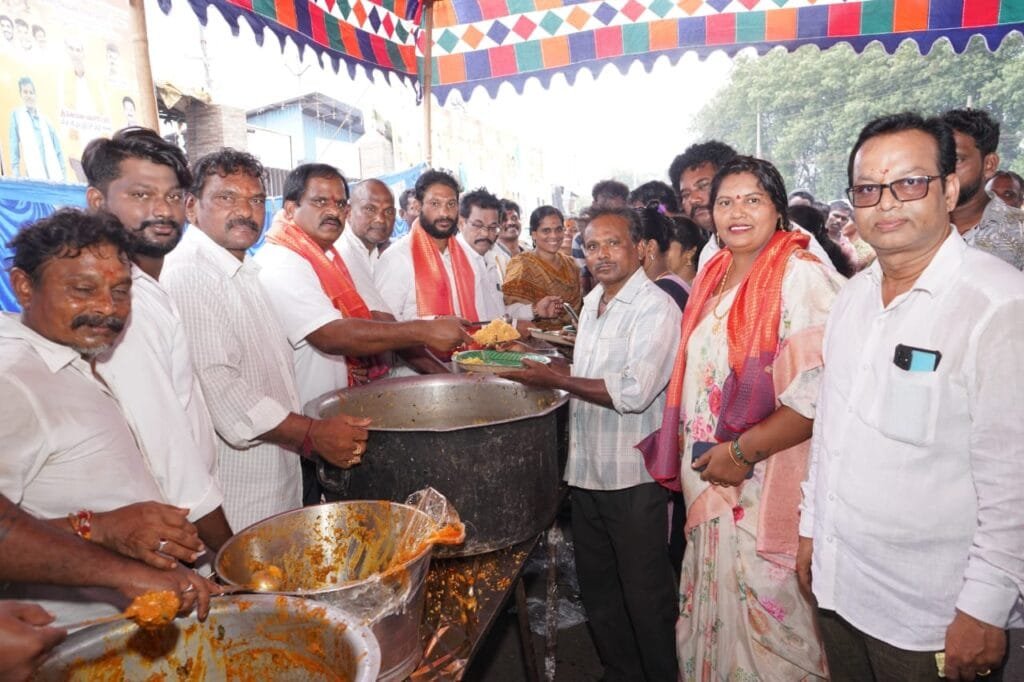 వినాయక చవితి నవరాత్రి మహోత్సవములలో భాగంగా ఈరోజు 35, 36 వార్డులలో ఏర్పాటు చేసిన అన్న సమారాధన కార్యక్రమాలలో ఎమ్మెల్యే వంశీకృష్ణ శ్రీనివాస్ పాల్గొన్నారు. 35వ వార్డ్ హోల్సేల్ ఫ్రూట్స్ మార్కెట్ వద్ద జరిగిన అన్న సమారాధన కార్యక్రమం, రైతు బజార్ వద్ద జరిగిన అన్న సమారాధన కార్యక్రమం మరియు 36 వ వార్డు రంగ రీజు వీధి వద్ద జరిగిన అన్న సమారాధన కార్యక్రమాలలో ఎమ్మెల్యే వంశీకృష్ణ శ్రీనివాస్ అన్నదాన కౌంటర్లను ప్రారంభించి, భక్తులకు అన్నప్రసాదాన్ని కాసేపు వడ్డించారు. అనంతరం ఎమ్మెల్యే వంశీకృష్ణ శ్రీనివాస్ మాట్లాడుతూ మహా గణపతి ఆశీస్సులతో ఉత్సవాలు మరింత ఘనంగా జరగడానికి దేవుని యొక్క ఆశీస్సులు అందరి పైన ఉండాలని అన్నారు. కార్యక్రమంలో 35, 36 వార్డుల ఇంచార్జ్ లు లంకా. త్రినాధ్, బుచ్చా. రామిరెడ్డి మరియు కూటమి నేతలు, స్థానిక నిర్వాహకులు, అభిమానులు పాల్గొన్నారు.