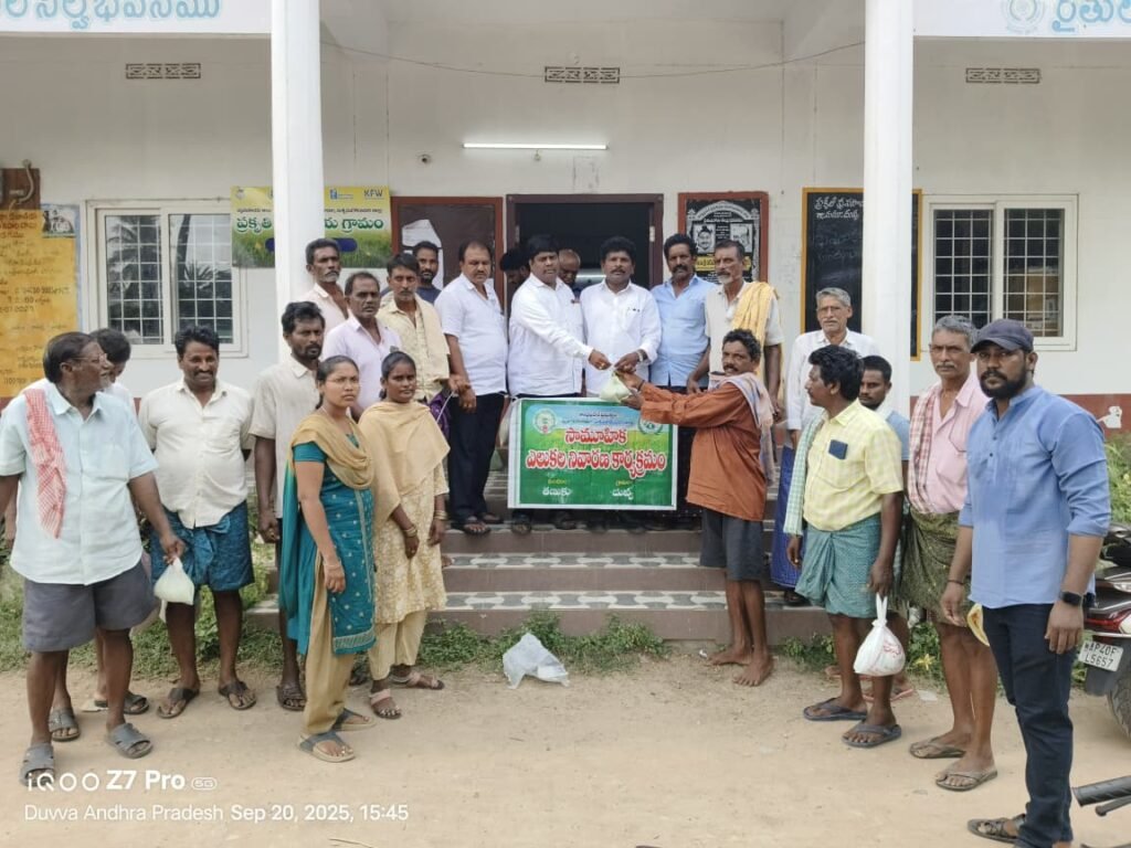 తణుకు మండలంలో దువ్వ, కొమరవరం గ్రామాలలో సామూహిక ఎలుకల నిర్మూలన కార్యక్రమంలో భాగంగా ఉచిత ఎలుకల మందు పంపిణి కార్యక్రమం జరిగింది. ఈ కార్యక్రమంలో తణుకు ఎ.యం.సి. చైర్మన్ శ్రీ కొండేటి శివ మాట్లాడుతూ ప్రభుత్వం ఉచితంగా అందించే ఎలుకల మందును రైతు సోదరులు అందరు ఉపయోగించుకొని సామూహికంగా ఎలుకల నిర్మూలన కార్యక్రమం చేపట్టాలని తెలియచేసారు. ఈ కార్యక్రమంలో దువ్వ సహకార సోసైటీ చైర్మన్ చిక్కాల వేణు మాట్లాడుతూ రైతుసోదరులు ఎలుకల మందును పంటపోలలోనే కాకుండా పోరంబోకు భూములలో కూడా చేపట్టి ఈ ఎలుకల నిర్మూలనను మరింత సమర్ధవంతంగా నిర్వహించాలని తద్వారా ఎక్కువ దిగుబడి సాధించవచ్చని అన్నారు. ఈ కార్యక్రమంలో గ్రామ సర్పంచి అడ్డా బాబు, తెలుగుదేశంపార్టీ అధ్యక్షులు సిరిగిశెట్టి వెంకటేశ్వరరావు, రైతుసోదరులు పాల్గొన్నారు.