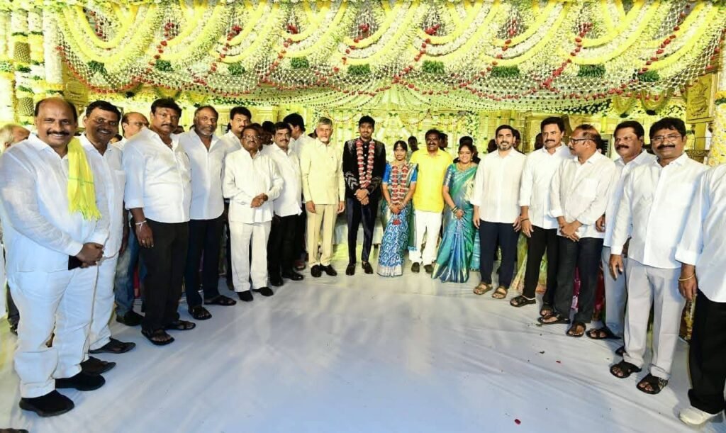 సీఎం చంద్రబాబుతో కలిసి నూతన దంపతులను ఆశీర్వదించిన ఎమ్మెల్యే రాధాకృష్ణ