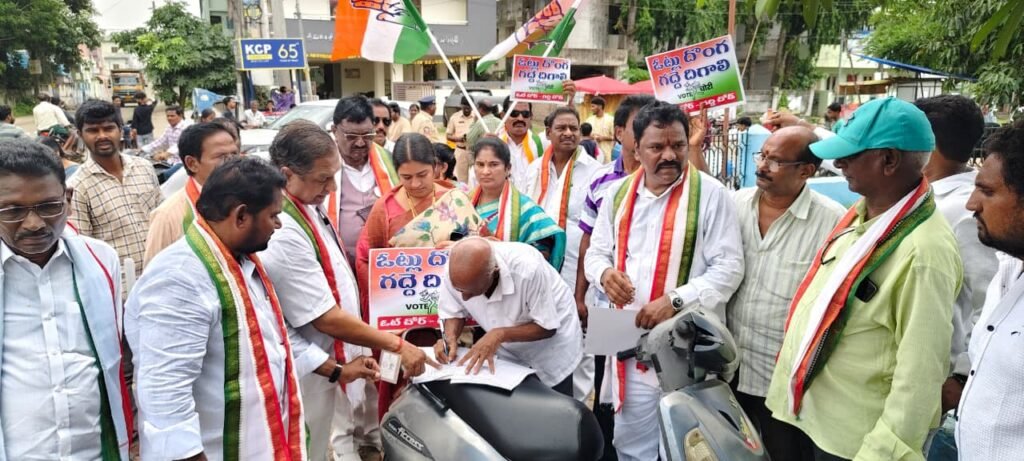 ఓట్ చోరీ కి వ్యతిరేకంగా నిడదవోలు నియోజకవర్గం కోఆర్డినేటర్ మేడవరపు భద్రం దొర ఆధ్వర్యంలో తూర్పుగోదావరి జిల్లా కాంగ్రెస్ కమిటీ అధ్యక్షులు శ్రీ టి కె విశ్వేశ్వర్ రెడ్డి, ఆంధ్రప్రదేశ్ కాంగ్రెస్ కమిటీ ఉపాధ్యక్షులు శ్రీ మార్టిన్ లూథర్ ముఖ్య అతిథులుగా విచ్చేసి నిడదవోలులో ప్రారంభించిన సంతకాల సేకరణ కార్యక్రమం జరిగింది. అనంతరం ఓట్ చోర్-గద్ది చోడ్ ఓట్ల దొంగ గద్దె దిగు అనే నినాదంతో నిడదవోలు నియోజకవర్గ కాంగ్రెస్ పార్టీ కోఆర్డినేటర్ మేడవరపు భద్రం దొర ఆధ్వర్యంలో మోడీ, ఎలక్షన్ కమిషన్ ల దిష్టిబొమ్మలను నిడదవోలు పట్టణంలోని గణేష్ చౌక్ సెంటర్ నుండి సంత మార్కెట్లో ఉన్న డాక్టర్ బి.ఆర్ అంబేద్కర్ గారి విగ్రహం వరకు శవ యాత్ర లాగా ఊరేగించిన కాంగ్రెస్ నాయకులు కార్యకర్తలు.