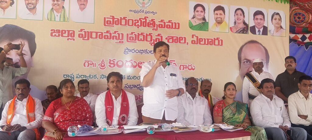 ఏలూరు: కేంద్ర పర్యాటక, సాంస్కృతిక శాఖ మంత్రి గజేంద్ర సింగ్ షెకావత్ తో చర్చించి ఏలూరుకు సంగీత నృత్య కళాశాల మంజూరుకు కృషి చేస్తానని మంత్రి కందుల దుర్గేష్ హామీ ఇచ్చారు. రూ. 5.25 కోట్ల కేంద్ర, రాష్ట్ర ప్రభుత్వాల నిధులతో ఏలూరు జిల్లా కేంద్రంలో ఏర్పాటు చేసిన జిల్లా పురావస్తు ప్రదర్శనశాలను మంత్రి కందుల దుర్గేష్ మంగళవారం ప్రారంభించారు. అనంతరం జిల్లా పురావస్తు మ్యూజియంలోని డిజిటల్ బుక్ రూమ్ ను, స్కల్ప్చర్ గ్యాలరీని సందర్శించారు. అధునాతన టెక్నాలజీతో రూపొందించిన డిజిటల్ బుక్ లో ప్రతి పేజీలోని ఇమేజిని తాకితే ప్రత్యక్ష అనుభూతిని పొందడం ఆశ్చర్యంగా ఉందని ఆసక్తిగా తిలకించారు. అదే విధంగా కాంస్యకళతో రూపొందించిన శ్రీరామ, లక్ష్మీనారాయణ, గరుడ, వైష్ణవ ఋషి, మావటి విగ్రహాలను తిలకించారు. భారతీయ జీవితాన్ని, ఆలోచనలు ప్రతిబింబింప చేసిన హిందూ, జైన, బౌద్ధ మతాలకు సంబంధించిన బుద్ధుడు, జైన తీర్థంకరులు, విష్ణువు వెంకటేశ్వరుడు, ఆల్వార్లు, శ్రీదేవి, భూదేవి, నటరాజ కాంస్య శిల్పాలను పరిశీలించారు. నాటి కాలానికి సంబంధించిన శిరస్త్రాణం, ఖడ్గములు, డాలు, ఆయుధాలు, కవచాలను చూసారు. తొలి చారిత్రక యుగపు మృణ్మయ పాత్రలు, బృహత్ శిలాయుగం నాటి సమాధులు, జీవన విధానాలను తెలిపే చిత్రాలను, ప్రాచీన, మధ్య, నవీన శిలాయుగాల నాటి పరికరాలను, ఆది మానవుడిని మొదలుకొని నేటి మానవ వికాస దశలను, రుద్రమకోట బృహ శిలాయుగ సమాధులను పరిశీలించారు. అదే విధంగా తూర్పు చాళుక్యులు, తుగ్లక్, విజయనగర వంశం, శాలం కాయనుల, శాతవాహన, సదవంశం, విద్ధంక, కుర రాజవంశ, ఈస్ట్ ఇండియా, పోర్చుగీస్, ట్రావెన్ కోర్ సంస్థానం, బ్రిటిష్ ఇండియా, ఇండో ఫ్రెంచి, సుమత్రా దీవి, హెల్కర్, బహుమనీ, గోల్కొండ సుల్తానులు, మధురై నాయక వంశం, మరాఠా సామ్రాజ్యం, అసబ్ జాహీ కాలం నాటి నాణేలు, పంచలోహ విగ్రహాలు, శిలాజాలు, తాళపత్ర గ్రంధాలు, తామ్ర శాసనాలు, ఖురాన్ చేతి ప్రతి గ్రంధాలు పరిశీలించారు.