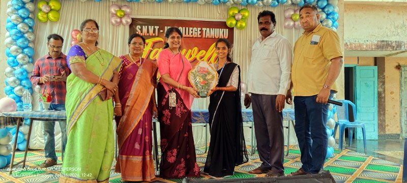 తణుకు పట్టణంలోని శ్రీమతి నడింపల్లి వర్ధనమ్మ తిరుపతిరాజు ప్రభుత్వ జూనియర్ కళాశాల ఎస్.ఎన్.వి.టి.లో సోమవారం నిర్వహించిన వీడ్కోలు సభ ఉత్సాహభరితంగా, ఆనందోత్సాహాల మధ్య జరిగింది. ఈ కార్యక్రమంలో ముఖ్యఅతిథిగా హాజరైన భారతీయ జనతా పార్టీ అధికార ప్రతినిధి డా. ముళ్ళపూడి రేణుక మాట్లాడుతూ విద్యార్థులు తమ జీవితాల్లో ఉన్నత లక్ష్యాలను ఏర్పరచుకుని, కష్టపడి సాధించాలని సూచించారు. ఆత్మవిశ్వాసం, క్రమశిక్షణ, పట్టుదలతో ముందుకు సాగితే విజయాన్ని సాధించగలరని ఆమె పేర్కొన్నారు. నేటిసమాజానికి ఉపయోగపడే వ్యక్తులుగా తయారు కావాలని విద్యార్థులకు పిలుపునిచ్చారు. విద్యార్థుల భవిష్యత్తు ఉజ్వలంగా ఉండాలని ఆకాంక్షించారు. ఇంటర్మీడియట్ ఒకేషనల్ ఎం.పి.హెచ్.డబ్ల్యు గ్రూప్ లో జిల్లాలో మొదటి స్థానం సాధించిన వచ్చిన విద్యార్థి కొల్లి బ్లేస్సిని అభినందించారు. వీడ్కోలు వేడుకలో విద్యార్థుల సాంస్కృతిక కార్యక్రమాలు, అనుభవాల ముచ్చట్లు ప్రత్యేక ఆకర్షణగా నిలిచాయి.ఈ కార్యక్రమంలో కళాశాల ప్రిన్సిపాల్ వి.తులసి లక్ష్మి, జి. శ్యామ్ కుమార్, డి.శ్రీనివాసన్, కె. ప్రేమకుమారి, కళాశాల విద్యార్థిని, విద్యార్థులు పాల్గొన్నారు.