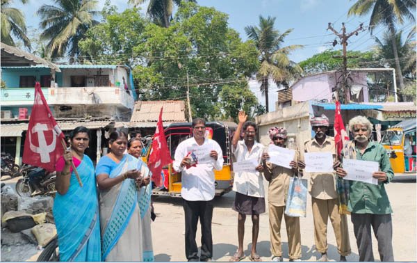 లేబర్ కోడ్స్ వెంటనే రద్దు చేయాలని సిఐటియు జిల్లా నాయకులు కామన మునిస్వామి కేంద్ర ప్రభుత్వాన్ని డిమాండ్ చేశారు. దేశవ్యాప్త పిలుపులోని అనుసరించి సిఐటియు ఆధ్వర్యంలో బుధవారం నాడు ఇరగవరం మండల కేంద్రంలో లేబర్ కోడ్స్ వ్యతిరేకంగా నిరసన తెలియజేశారు. ఈ సందర్భంగా కామనమునిస్వామి మాట్లాడుతూ కేంద్ర ప్రభుత్వం అధికారంలోకి వచ్చిన తర్వాత కార్మికుల చట్టాలన్నిటిని మార్చి వేసిందని 44 లేబర్ చట్టాలను మార్చివేసి నాలుగు లేబర్ కోడ్స్ గా ఏర్పాటు చేసిందని అన్నారు. పనిచేసే కార్మికునికి కొత్త చట్టాల వలన ఎటువంటి రక్షణ, ఉద్యోగ భద్రత లేదన్నారు. అనేక మంది ప్రాణత్యాగ ఫలితంగా ఎనిమిది గంటల పనిదినాలను సాధించుకున్నారని ఇప్పుడు కేంద్ర రాష్ట్ర ప్రభుత్వాలు దాన్ని12 గంటలకు మార్చారని అన్నారు. మహిళలు అర్ధరాత్రి షిఫ్ట్ లో పనిచేయవచ్చునని చెప్పడం దుర్మార్గమైన చర్యని అన్నారు. కనీసవేతనం 26,000 ఇవ్వాలని సుప్రీంకోర్టు తీర్పు చెప్పిన దానిని అమలు చేయడం లేదన్నారు. పాత లేబర్ కోడ్స్ని అమలు చేయాలని కొత్త వాటిని రద్దు చేయాలని ఆయన కేంద్ర ప్రభుత్వాన్ని డిమాండ్ చేశారు. కేంద్రం ప్రవేశపెట్టిన కార్మిక వ్యతిరేక చట్టాలను రాష్ట్ర ప్రభుత్వం అమలు చేస్తుందని అన్నారు. ఫ్యాక్టరీలలో తనిఖీ విధానాన్ని నిలుపుదల చేశారని దీనివల్ల కార్మికులకు రక్షణ కరువైందని అన్నారు. కాంట్రాక్టు, హౌస్ సోర్సింగ్ విధానాల వల్ల కార్మికులకు చట్టాలు ఏవి వర్తించుము లేదని అన్నారు. కార్మికులంతా ఐక్యంగా పాత చట్టాలు అమలు అయ్యేవరకు కలిసి పోరాడాలని ఆయన పిలుపునిచ్చారు. ఈ కార్యక్రమంలో అంగన్వాడి వర్కర్స్, పంచాయతీ కార్మికులు తదితరులు పాల్గొన్నారు.