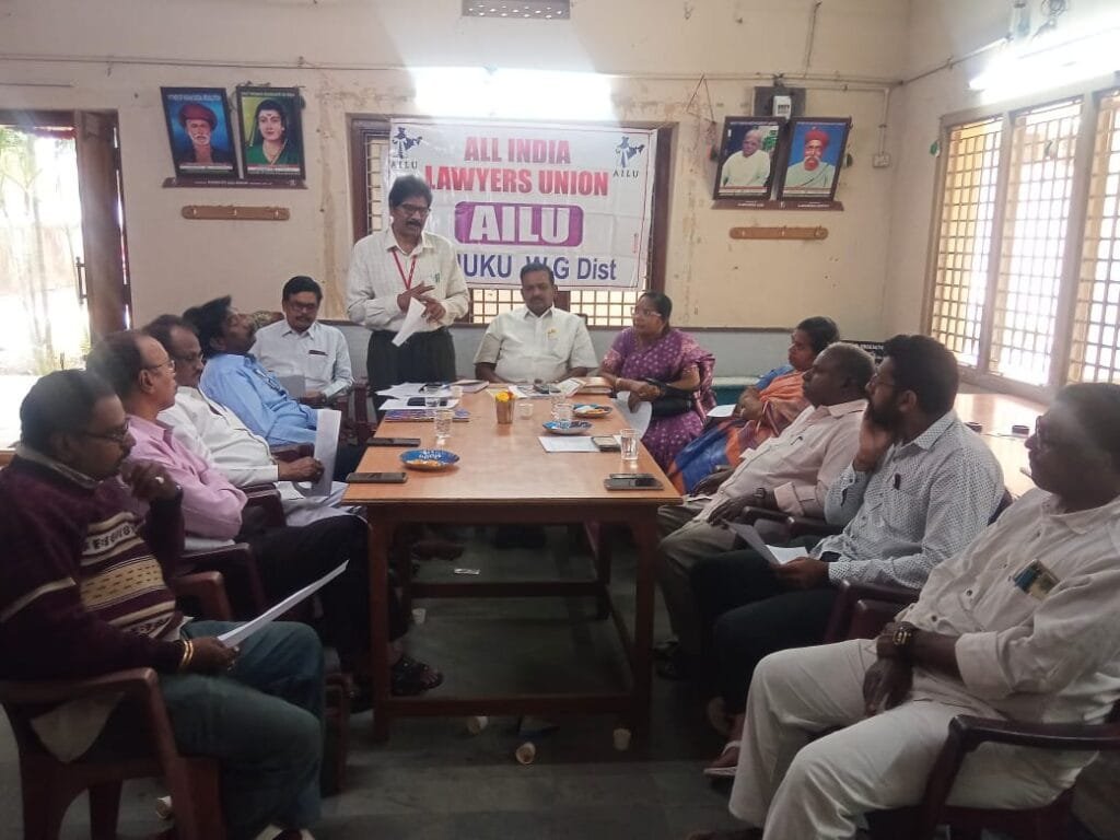 కేంద్ర ప్రభుత్వాన్ని డిమాండ్ చేశారు. ఆల్ ఇండియా లాయర్స్ యూనియన్ ఉభయ జిల్లాల కమిటీ సమావేశం మేక ఈశ్వరయ్య అధ్యక్షుడు ఆదివారం తణుకు బార్ అసోసియేషన్ లో జరిగినది .ఈ సమావేశంలో ఐలు ప్రధాన కార్యదర్శి కామన మునిస్వామి మాట్లాడుతూ ఇప్పటివరకు న్యాయవాదుల వృత్తిలో ఏవైనా లోపాలు జరిగిన దానిపై విచారణ జరిగే అధికారం ఆ రాష్ట్రంలో ఉన్న బార్ కౌన్సిల్ ఉన్నదని మునిస్వామి అన్నారు. కానీ నేడు కేంద్ర ప్రభుత్వం బార్ కౌన్సిల్ అధికారాలను తగ్గించి న్యాయవ్యవస్థకు న్యాయవాదులపై చర్యలు తీసుకునే విస్తృత అధికారాలను కట్టబెట్టాలని ఆలోచనలు ఉన్నదని మునుస్వామి అన్నారు. జూనియర్ న్యాయవాదులకు ప్రభుత్వము ఇచ్చే స్టైపండ్ ఎన్టీఆర్ నేస్తం వెంటనే విడుదల చేసి జూనియర్ న్యాయవాదులను ఆదుకోవాలని మునిస్వామి అన్నారు. బార్ కౌన్సిలకు రాష్ట్రప్రభుత్వం ఇవ్వాల్సిన మ్యాచింగ్ గ్రాంట్ 35 కోట్ల రూపాయలు వెంటనే విడుదల చేయాలని ప్రభుత్వానికి విజ్ఞప్తి చేశారు. ప్రతి ఐదు సంవత్సరాలకు జరిగే సర్టిఫికెట్స్ వెరిఫికేషన్ విధానంలో జూనియర్ న్యాయవాదులను మినహాయించాలని మునిస్వామి బార్ కౌన్సిల్కు విజ్ఞప్తి చేశారు. జూనియర్ న్యాయవాదులకు జిల్లాస్థాయిలో క్లాసులు నిర్వహించాలని, స్థానిక బార్ అసోసియేషన్ లో ఉన్న సమస్యలను గుర్తించి న్యాయమూర్తులు దృష్టికి తీసుకెళ్లాలని న్యాయవాదుల రక్షణకు సమగ్రమైన చట్టాన్ని ప్రభుత్వం చేయాలని న్యాయవాదులకు మెడికల్ ఇన్సూరెన్స్లను ప్రభుత్వ చెల్లించాలని పలుతీర్మానాలు సమావేశం చేసింది. ఈ సమావేశంలో జిల్లాకమిటీ సభ్యులు కొవ్వూరు వెంకటేశ్వర్లు, పి.పి.లక్ష్మి పామర్తి నగేష్, కెవి.సుబ్రహ్మణ్యం, ధనాల అప్పారావు, పి.పెద్దిరాజు, వీ.లలితకుమారి, జి.రాజారావు, వై.మణికంఠ, తేజ తదితరులు పాల్గొన్నారు.