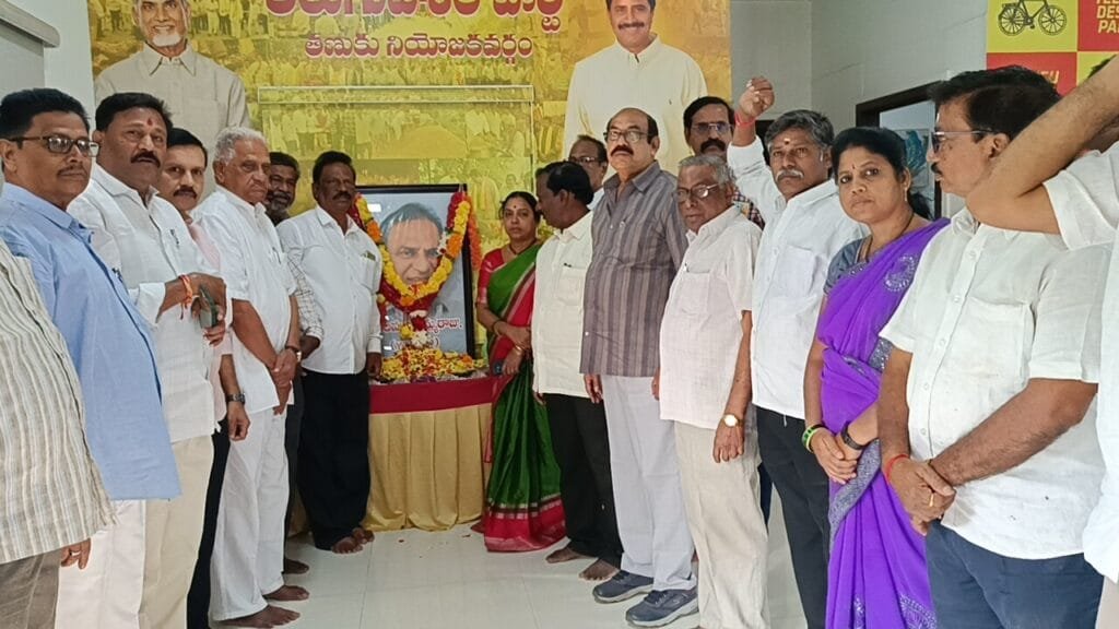 తణుకు నియోజకవర్గ మాజీ శాసనసభ్యులు యలమర్తి తిమ్మరాజా (వై.టి. రాజా) జయంతి సందర్భంగా తణుకు ఎమ్మెల్యే కార్యాలయంలో వై.టి.ఆర్. చితపటానికి పూలమాలలు వేసిన ఘన నివాళులర్పించిన కూటమి నాయకులు, మాజీ శాసనసభ్యులు ముళ్ళపూడి వెంకట కృష్ణారావు, వైటి రాజా చిత్రపటానికి పూలమాలలు వేసి ఘన నివాళులు అర్పించారు. ఈ సందర్భంగా మాజీ శాసనసభ్యులు ముళ్ళపూడి వెంకట కృష్ణారావు మాట్లాడుతూ తణుకు నియోజకవర్గానికి ఎన్నో అభివృద్ధి కార్యక్రమాలు చేసి నియోజకవర్గ అభివృద్ధికి ఎంతగానో కృషి చేసిన వ్యక్తి వై.టి రాజా అని అన్నారు. సామాజిక సేవలు అందించడంలో వై.టి రాజా ముందుండేవారిని, తెలుగుదేశం పార్టీ పట్ల ఆయనకున్న నిబద్ధత, నిజాయితీ వెలకట్టలేనిదని అన్నారు. ఆఖరి శ్వాస వరకు పార్టీకి చిత్తశుద్ధితో సేవలందించినటువంటి మహోన్నత వ్యక్తి వై.టి రాజా అని అన్నారు. విలువలతో కూడిన రాజకీయాలకు మార్గదర్శకంగా ఉండే వారిని అన్నారు. అనంతరం తణుకు శాసనసభ్యులు అరిమిల్లి రాధాకృష్ణ ఆదేశాల మేరకు ప్రభుత్వ హాస్పిటల్ నందు పేషెంట్లకు పండులు పంపిణీ కార్యక్రమం చేయడం జరిగింది, ఈ కార్యక్రమంలో టి.డి.పి.నాయకులు కలగర వెంకట కృష్ణారావు, బసవా రామకృష్ణ, వావిలాల సరళాదేవి, వంటెద్దు రాజా, గుబ్బల శ్రీనివాసు, కూటమి నాయకులు, కార్యకర్తలు తదితరులు పాల్గొన్నారు.