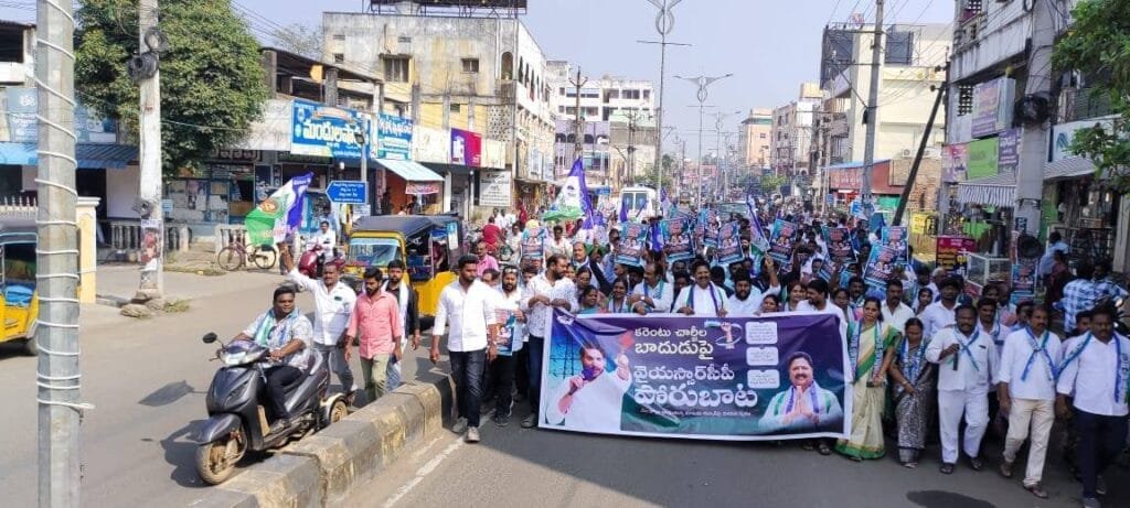 ఆంధ్రప్రదేశ్ రాష్ట్ర ప్రజల పై కూటమి ప్రభుత్వం పెంచిన విద్యుత్ ఛార్జీలు భారాన్ని తగ్గించాలని డిమాండ్ చేస్తూ మాజీ ముఖ్యమంత్రి, వైసిపి అధినేత వైయస్ జగన్మోహన్ రెడ్డి ఆదేశాలతో ఆదేశానుసారం, మాజీ మంత్రి డా. కారుమూరి వెంకట నాగేశ్వరరావు ఆధ్వర్యంలో తణుకు పట్టణంలో జరిగిన “విద్యుత్ ఛార్జీలు పై పోరుబాట” కార్యక్రమంలో తణుకు అసెంబ్లీ నియోజకవర్గ వ్యాప్తంగా ఉన్న వైసిపి నాయకులు కార్యకర్తలు పాల్గొన్నారు. ఈ సందర్భంగా తణుకు పట్టణంలో నరేంద్ర సెంటర్ నుండి వేల్పూర్ రోడ్ లో ఉన్న విద్యుత్ కార్యాలయం వరకు వైసీపీ శ్రేణులు ర్యాలీ నిర్వహించి విద్యుత్ శాఖ అధికారులకు వినతి పత్రం అందించారు. రాష్ట్రవ్యాప్తంగా ప్రజలపై కరెంటు చార్జీల బాదుడిపై వైఎస్ఆర్సిపి బోరుబాట కార్యక్రమంలో ప్రజాప్రతినిధులు కార్యకర్తలు ప్రజలతో కలిసి ప్లకార్డులు చేతపట్టుకుని పట్టణంలో భారీ జనసంద్రం నడుమ ర్యాలీ గా బయలుదేరి నిరసన తెలపడం జరిగింది. ఈ సందర్భంగా మాజీ రాష్ట్ర పౌరసరఫరాల శాఖ మంత్రి కారుమూరి వెంకట నాగేశ్వరరావు మాట్లాడుతూ అబద్ధపు హామీలతో గద్దెనెక్కి కరెంటు చార్జీలతో ప్రజలకు చుక్కలు చూపుతున్న ఈ కూటమి ప్రభుత్వం తక్షణమే గృహ వినియోగదారులపై మోపిన రూ.15,485 కోట్ల చార్జీల బాదుడును వెనక్కు తీసుకోవాలని, ఎన్నికల్లో కూటమి ప్రభుత్వం ఇచ్చిన హామీ విధంగా చార్జీల పెంపును నిలిపివేయాలని, ఎస్సీ ఎస్టీలకు 200 యూనిట్ల ఉచిత విద్యుత్ కొనసాగించాలని ఈ సందర్భంగా కూటమి ప్రభుత్వాన్ని డిమాండ్ చేస్తున్నామని తెలిపారు.